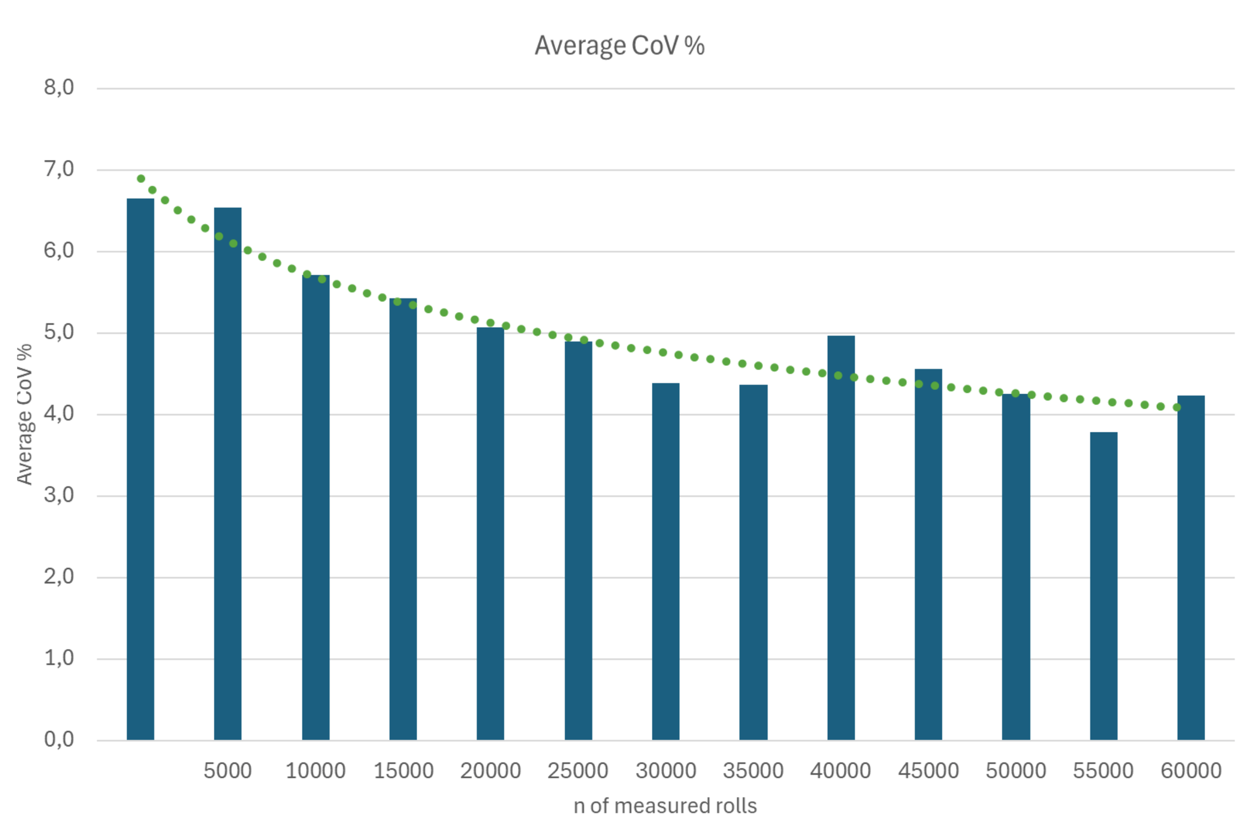 The dotted green line in the figure shows the decreasing trend of CoV as more rolls are measured and controlled inline. The data demonstrates that with ACA ROQ Inline, roll quality variations become progressively smaller, leading to a more stable production process.